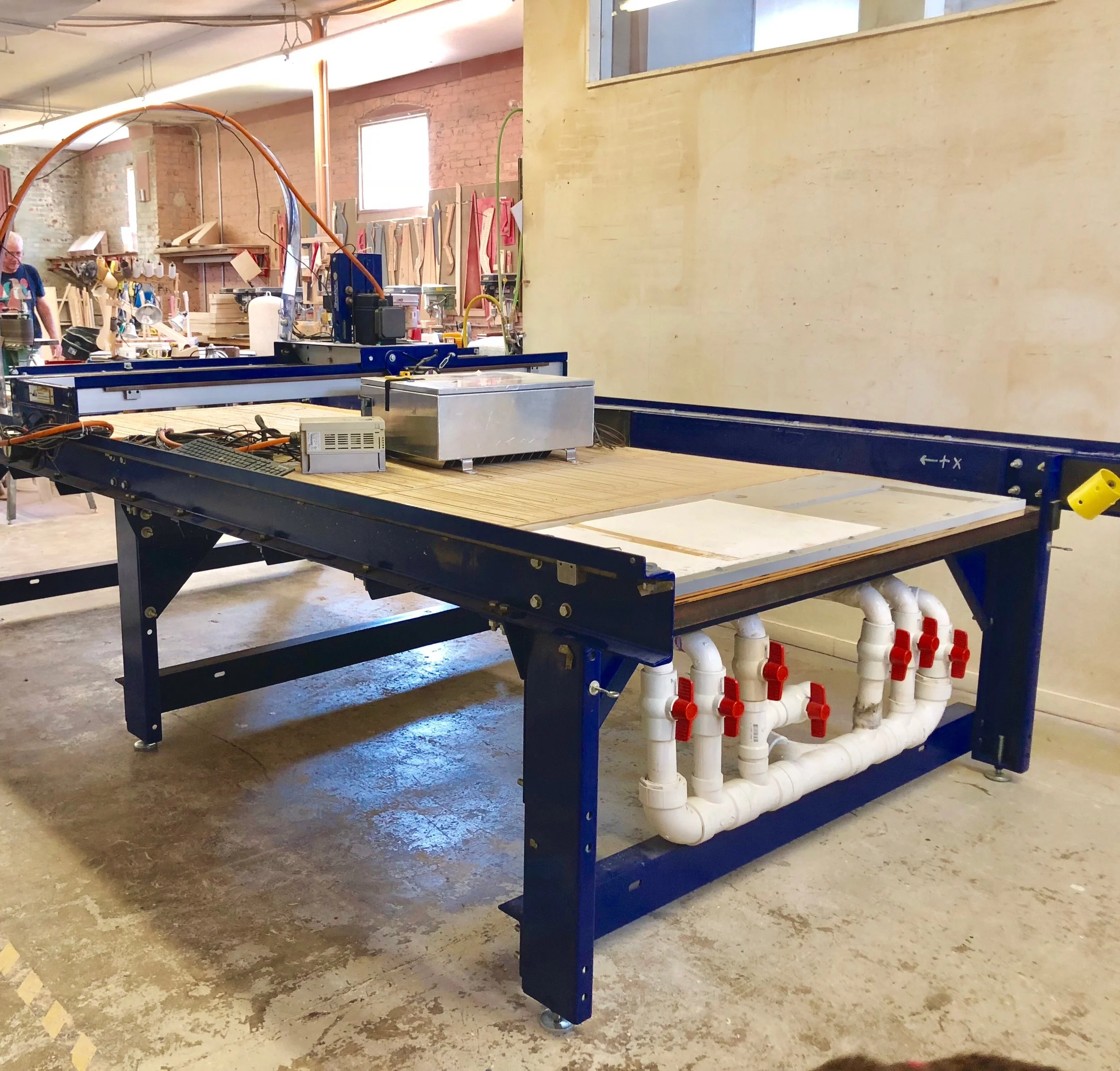 Last summer, when it was really really hot (yuck!), we got a new CNC Machine. What is that???? Well, from what I can see, it looks like a really big table (like, really really big) with pathways of pipes underneath (don’t lick them.... they may look interesting, but they do NOT taste good... not that I can tell you from experience... … … actually, there WAS that one time…) Anywho, Pamela told me that “CNC” stands for Computer Numerical Control, which is still a confusing name to me. Basically, it will allow us to put some of the more standard patterns into the computer, and then it will do the cutting for us! This is huge because it means our people can spend more time doing the things that require a humans touch, while leaving the easier sawing to the computer.