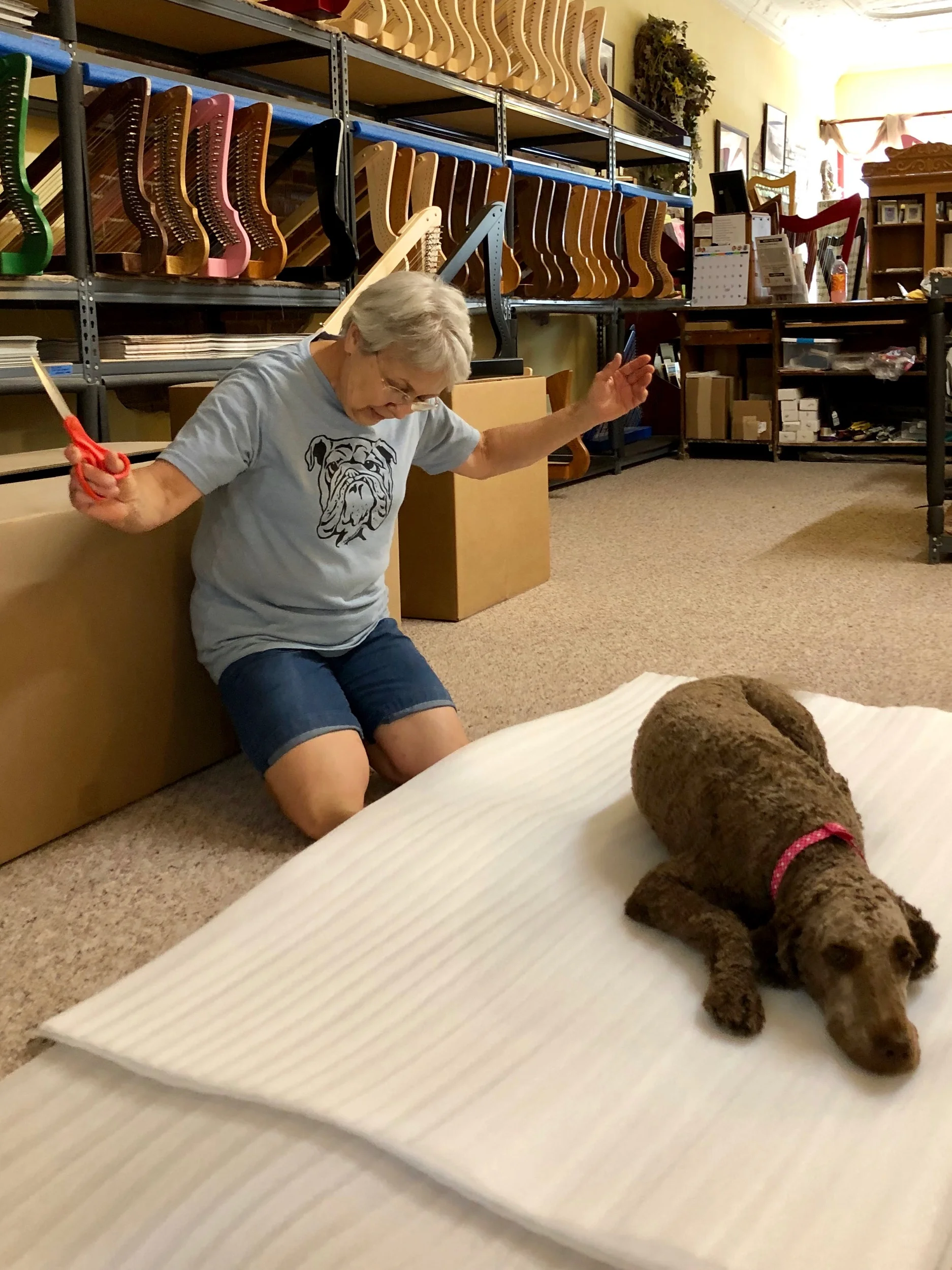 While this job is hard, it is so rewarding. I get to come in to the shop every day with my pack leader, William and help make sure the harps are built by people who are happy and enjoy their work. Sometimes, I will just lay by someone’s feet so they know they have a friend. Other times, I will initiate a game of fetch (you know, where they throw a toy and I run to get it and keep it forever without giving it back to them) or catch with Garen. But sometimes, I want to help. William won’t let me touch the harps yet (he says I have too much energy. How is that a bad thing??? It’s not like I’d run into one and break it!…. okay… maybe my tail would… but I can’t control it when I get excited!!!) so I have to find other ways to help. Today, for example, I am helping Joann cut foam to ship the harps with. It’s a great job, she LOVES my help, and I love knowing that I am making her job easier!